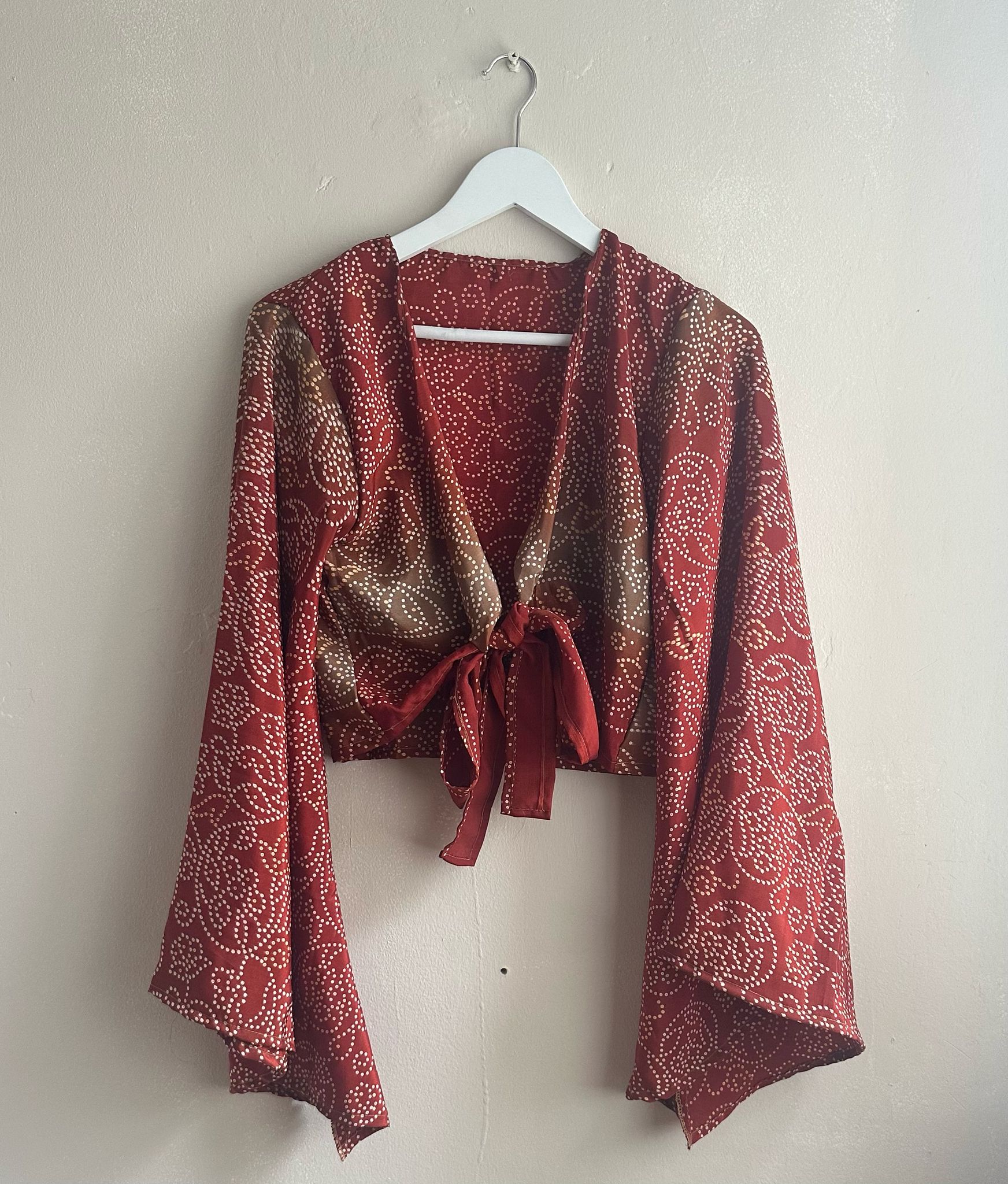 Embrace vibrant, sustainable style with our Recycled Sari Wrap Tops. Each piece is uniquely crafted from upcycled saris, offering a one-of-a-kind design that celebrates both culture and craftsmanship. With a versatile wrap style and one size fits all.